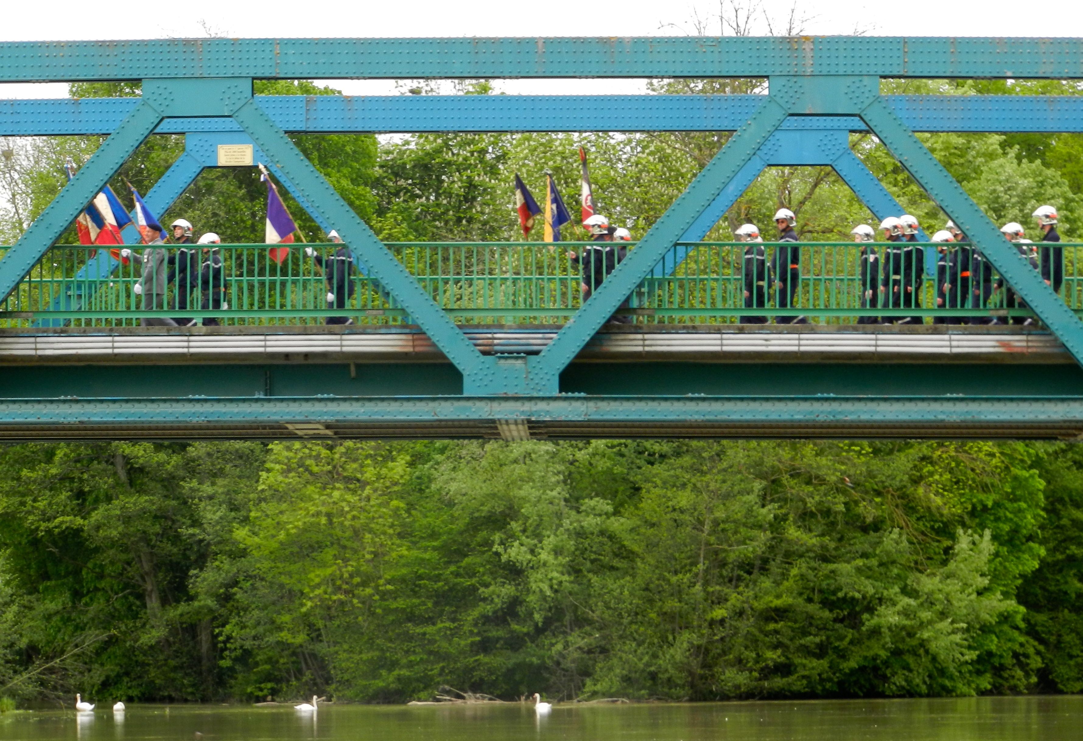 Later, at noon, after our bike ride, all the town’s church bells began ringing. We heard music and looked up at the bridge (the one that replaced the Marne bridge the Germans destroyed) to see musicians, soldiers, firefighters and a crowd marching across. We quickly joined the parade.