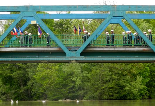 On the far side of the bridge were stone memorials to the First and Second World Wars. The band played, the mayor gave a speech, flags waved, everybody sang the La Marseillaise, then they marched back across the bridge for lunch.