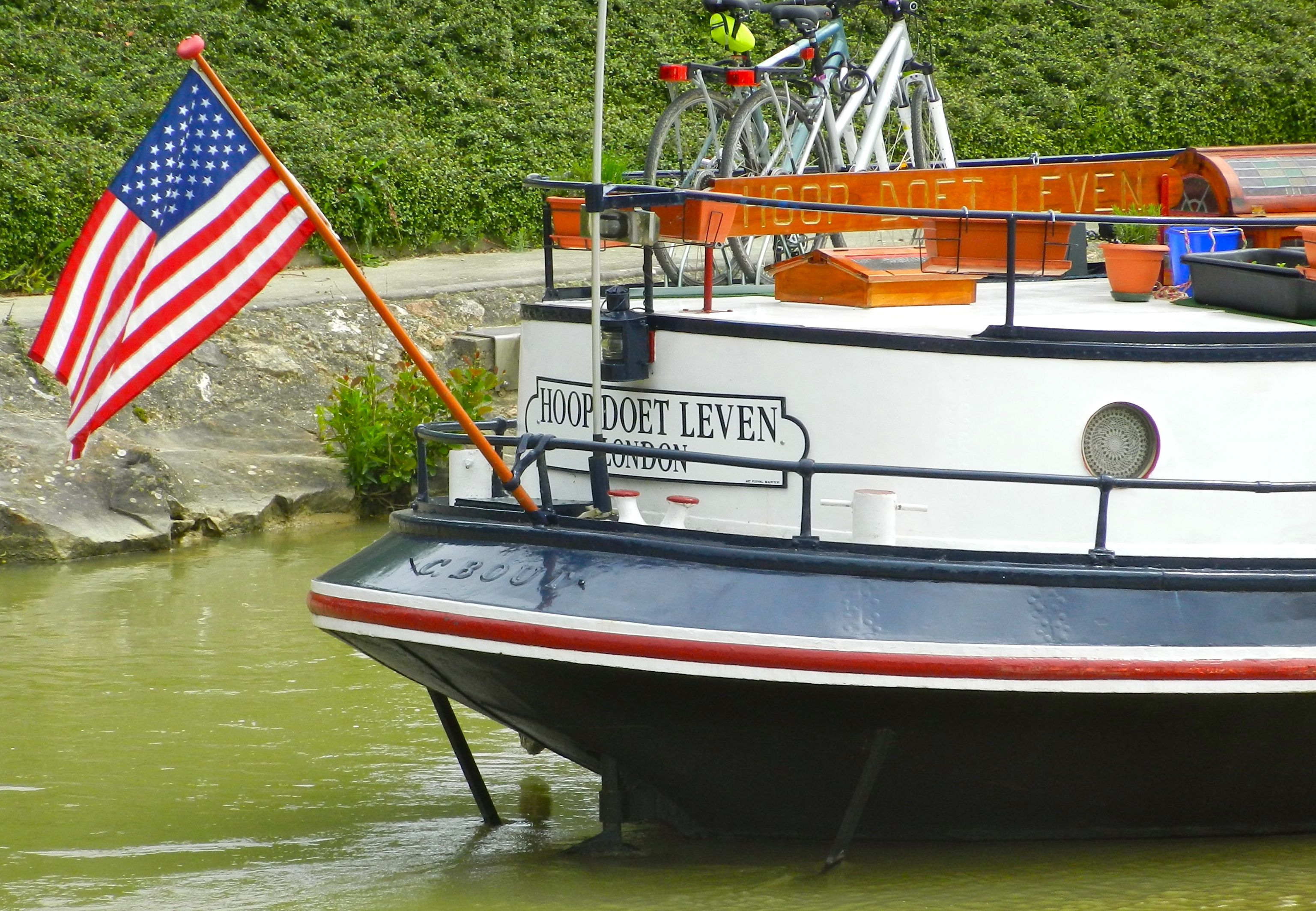 Today was a good day to fly the American flag on Hoop Doet Leven. We’d wondered what flag to fly. Technically, the boat is registered in the United Kingdom and should fly a British flag, the Red Ensign identifying it as a British civilian vessel. That is what it flew formerly. But we felt a tad foolish pretending to be Brits, couldn’t manage the accent or remember the words to Britannia Rules the Waves. On the other hand, there have been some uncomfortable moments in Franco-American relations (please don’t force us to utter either “freedom fries” or “cheese eating surrender monkeys” from the Simpsons). Nonetheless, we’ve been flying a rather large West Marine version of the Stars and Stripes from Hoop’s stern. We’ve never had a bad reaction. In fact, it has been just the opposite. It is surprising how often we are asked, somewhat stiffly, whether we are English. When we respond with “no, no, no” (a word never said just once; one waiter educated us about the difference between saying “no, no,” which means “no,” and “no, oui,” which for some reason means “yes”), and we say “nous sommes américaine” (we are Americans), the questioner invariably breaks out in a grin and asks if we’ve ever been to New York, which to most French seems to be the equivalent of the Emerald City in Oz, but with classier jeans.