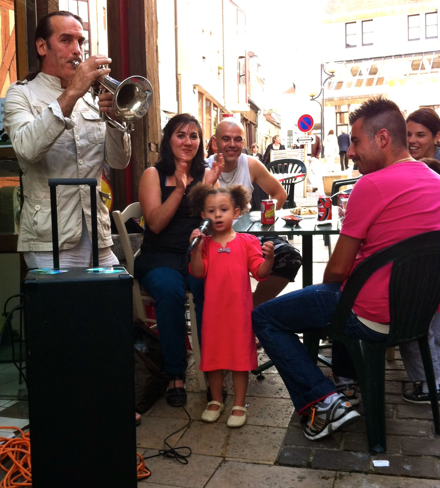 In front of him sat a family at a table. The young girl took his microphone and sang along with made-up lyrics, French scat singing.