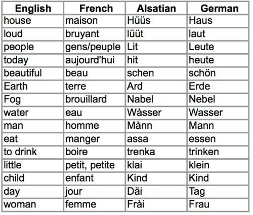 Alsace is where Hansel and Gretal would live if they spoke French. It is just a few hours drive from Bourgogne (also known as Burgundy), or a month by barge, moving at the lightning pace of an 80-year-old with a walker. Alsace was part of France until France came up on the short end of the Franco Prussian War in 1870. After that Alsace was part of Germany. The French language was verboten. Fortunately for the Alsatians, their Alsatian language is awfully similar to German, far more so than it is to French. Here’s a comparison from Wikipedia.