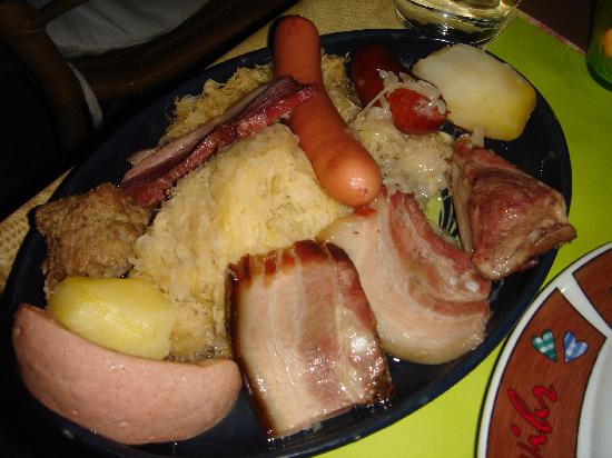 Or, more specifically, choucroute, a word that in and of itself coalesces the two warring nations. “Chou” is “cabbage” in French. “Croute” is “cabbage” in German. Choucroute. Cabbage-cabbage. A staple food with a double name, sort of like New York, New York. Taking it a step farther it becomes the dish most Alsatian of all Alsatian dishes, choucroute garni. A pile of sauerkraut topped with a pile of cholesterol, sausages, a potpouri of pork, frankfurters, bacon. Choucroute garni is the official food-to-eat in Alsace.