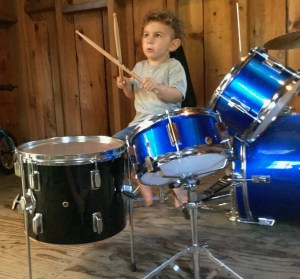 Meanwhile, Sandra, who is a fifth generation drummer, is doing her best to ensure that our grandson Ellis becomes a sixth generation drummer. His mini-drum set is set up in a shed in their back yard, with his Billy Joel-clone microphone on a stand. He practices for an hour every day. Wonderfully, at age three-and-a-half Ellis has already crossed the first threshold of musicality. The neighbors complain about the god-awful racket. We’ve decided that if he continues his musical career he’d better have a trust fund. Or a pizza delivery route.